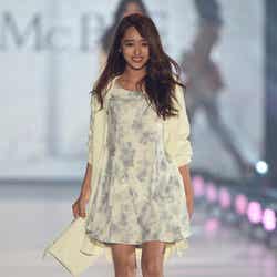 花柄ワンピース×ロングカーディガンにクラッチバッグを合わせたオールホワイトコーデで、「CECIL McBEE」ステージに登場した近藤。トレードマークである眉上のアシンメトリー前髪をすべて横に流し、大人可愛いスタイルでランウェイし、普段とは違った新たな魅力を醸し歓声を浴びた。