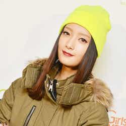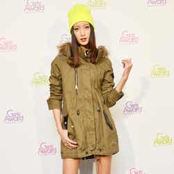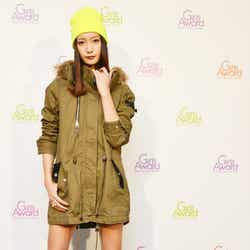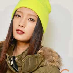菜々緒:モッズコートを一着で着こなすカタチなんですけど、その中にネオンカラーのニット帽を差し色で入れたところがポイントです。アクセサリーは今年のトレンドでもある、おおぶりなものを多めにつけています。