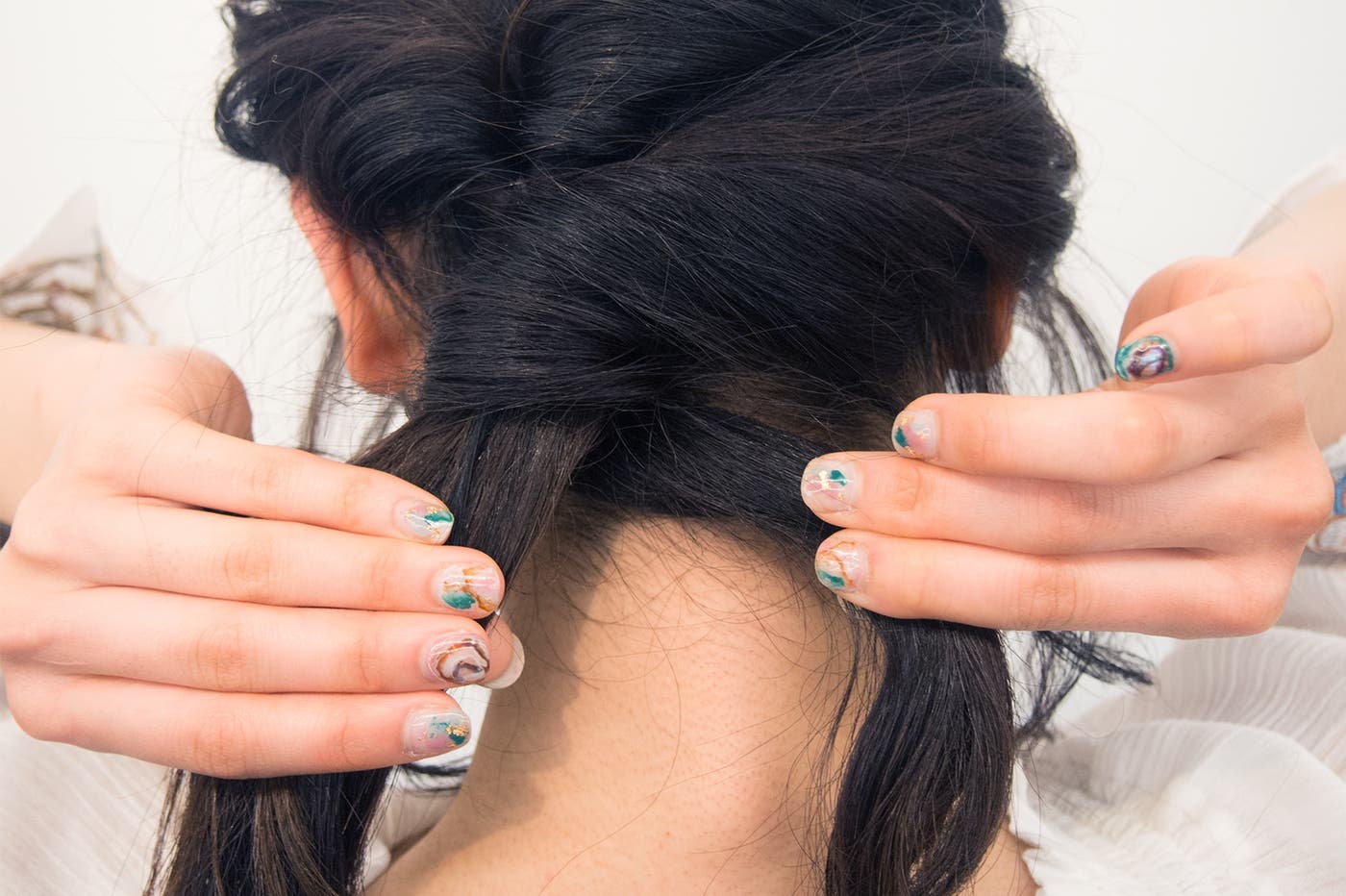 残りの髪をねじりながらひとつに束ね、先ほどのアレンジの結び目に1回巻きつけてからゴムで結びます。サイドの後れ毛は、さらにアイロンで巻きを加えてふんわり緩やかな動きをつければモテ感アップ。