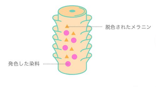 明るさ・発色・ケア感などの特長によって内容成分や仕上がりは様々ですが、どんなヘアカラーでも1剤と2剤という2種類の薬剤が使われること、混ぜた薬剤で発生した酸素がメラニン色素を脱色して発色させるのは同じです。
