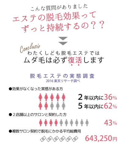 過去エステ脱毛を契約し、1年以上通った事がある女性を対象に調査を実施(※)したところ、「2年以内に」効果がなくなった実感がある人は36%、「5年以内に」効果がなくなった実感がある人は62%におよんだそう。結果として2店舗以上のサロンと契約した人は、脱毛経験者の43%を占めるとか。人気があったり金額が安いから良いサロンというわけではなく、中にはなかなか効果が感じられず、「気がついたら契約回数や期間が終わっていた」結果、高いお金を出しただけに後悔したなんてことも。
