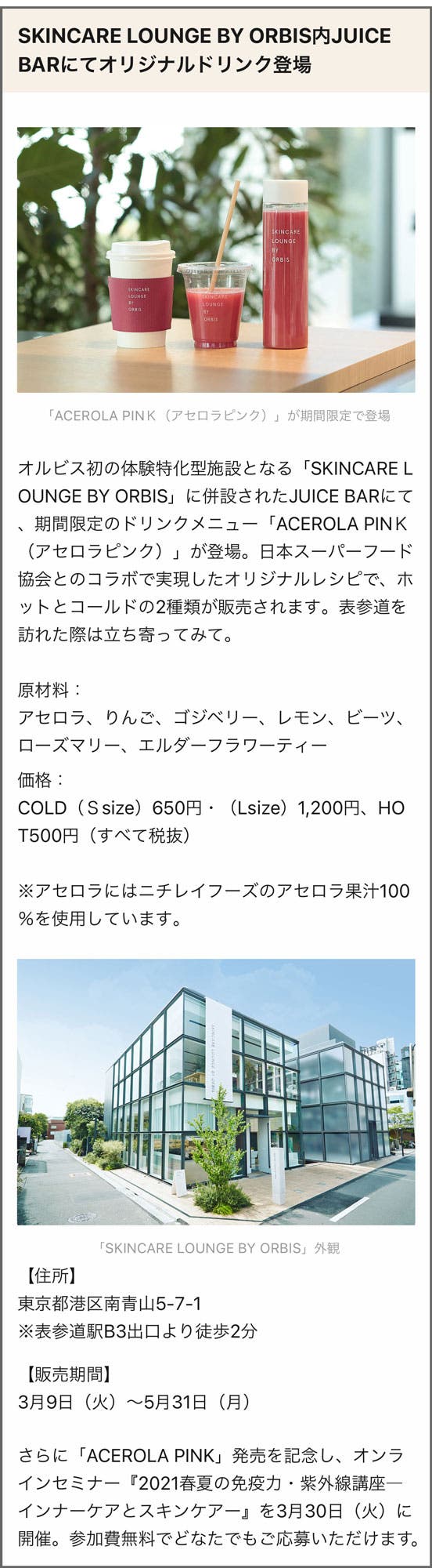 アセロラ果汁はポリフェノールを多く含むためビタミンCの吸収が早く、体の中に長く留まることもわかっています(※2)。「スーパーフード」と聞くと、なんだかハードルが高そうなイメージもありますが、アセロラのジュースならスーパーで手軽に手に入るのでトライしやすいですね。