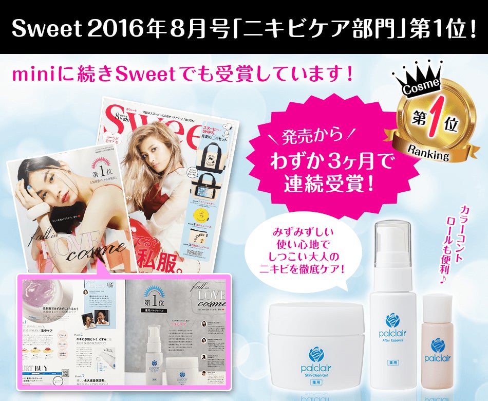 発売から3ヶ月で人気ファッション誌のニキビケアランキング1位を連続受賞し、今クチコミで話題の「パルクレール」。想定以上の売上を出したことから、この度プレス向けの発表会を開くことに。大人ニキビに効果的なオールインワンジェル「パルクレールジェル」と、ニキビケア後のサポートとしてニキビ跡の問題を解消する「パルクレール美容液」の商品説明が行われた。