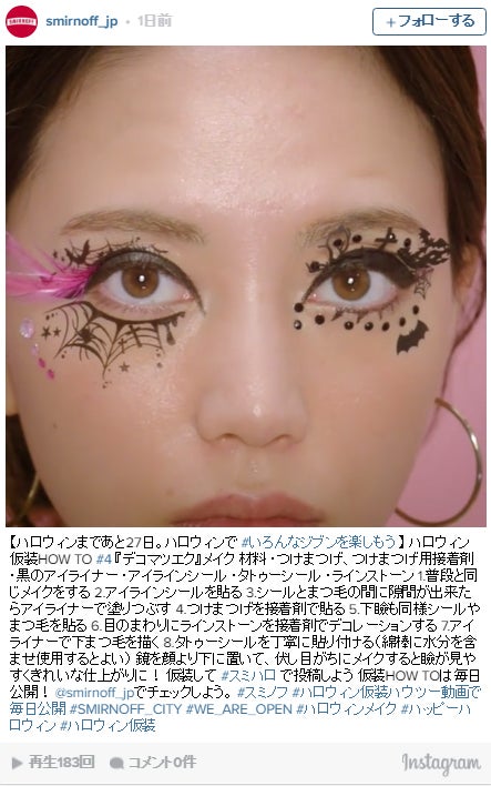 そんな『スミノフ』が提案する“いろんなジブンを楽しもう”というコンセプトのもと、見ているだけで試したくなるハロウィンメイクをインスタグラムで毎日更新中。ハロウィンまでのカウントダウンをしつつ、最終日までに毎日少しずつ絵が完成していくというサプライズ付きです。