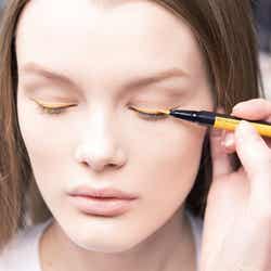 大胆でメッセージ性の強いコレクションのためにディオール メイクアップ クリエイティブ&イメージ ディレクターのピーター・フィリップスは、様々な色のサングラスに合わせたアイライナーで目元を描く、遊び心溢れるメイクアップをクリエイトした。
