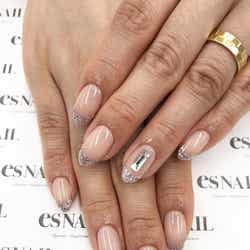クールトーンのピンクベージュにシルバーのラメでフレンチにすると甘さ控えめな印象に。