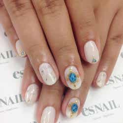 ベージュ寄りのグレージュのワンカラーネイルにパーツを乗せると、まるで素から綺麗な地爪にキラキラパーツが乗っているかのよう。