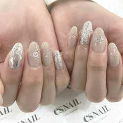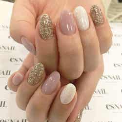 シャンパンゴールドのグリッターを合わせると華やかさもあるネイルに。