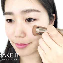 Tゾーンと顔の側面には重点的にのせ、目の下の三角ゾーンは薄く仕上げるとベースメイク全体がナチュラルに見えますよ。