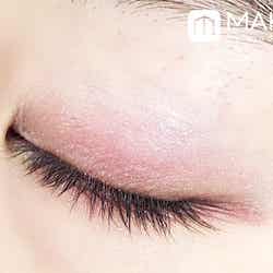 右下の赤みブラウンを細いチップで目のキワに入れ、右上の青みピンクを指でまぶた中央にぽんぽんと乗せます。