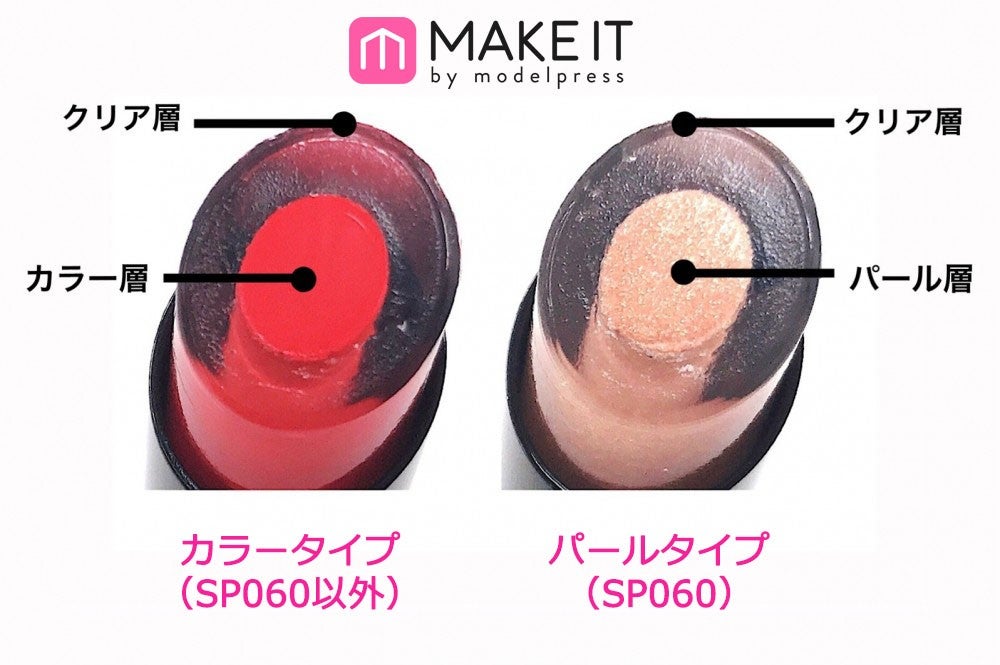 透明度の高いクリア層とカラー層(SP060のみパール層)の二層構造で、クリア層で唇にうるツヤ感を、カラー層で血色感を与えてくれます。