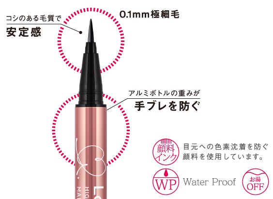 安定して描けるアルミボトルと、0.1mmと極細ながらコシのある毛質でアイラインの引き方は自由自在。