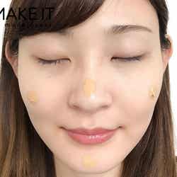 額・鼻・頬などにリキッド・クリームファンデーションを点置きしてから、パフでポンポンと馴染ませていきます。