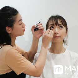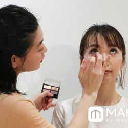 続いて、目尻のキワ、涙袋にもハイライトカラーを塗布し、ディープトーンのアイシャドウを使用しながらもやわらかい印象の目元に仕上げていく。