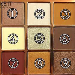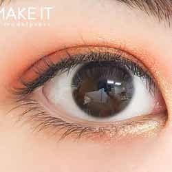 (9)MAPLE SYRUPマンモニズムは、肌にのせるとこう発色! (C)メイクイット”マンモニズム”は、 金色をメイン調色とした9色のアイシャドウパレット。クールなオレンジブラウン、情熱なパプリカオレンジ、パール入りのゴールドラメと不思議な発色の玉虫色などが揃っています。