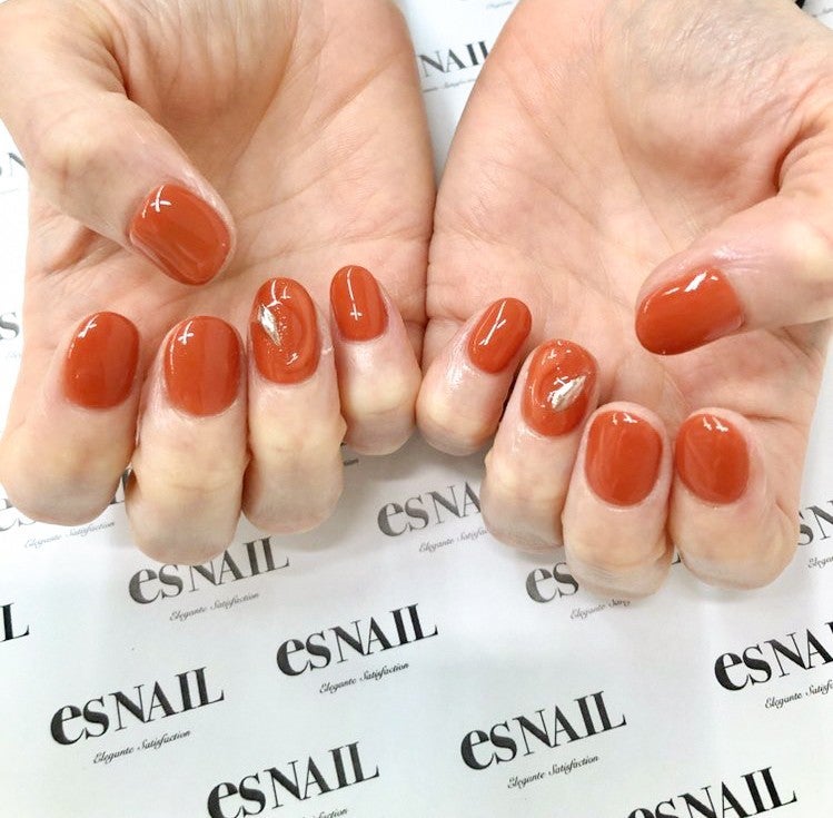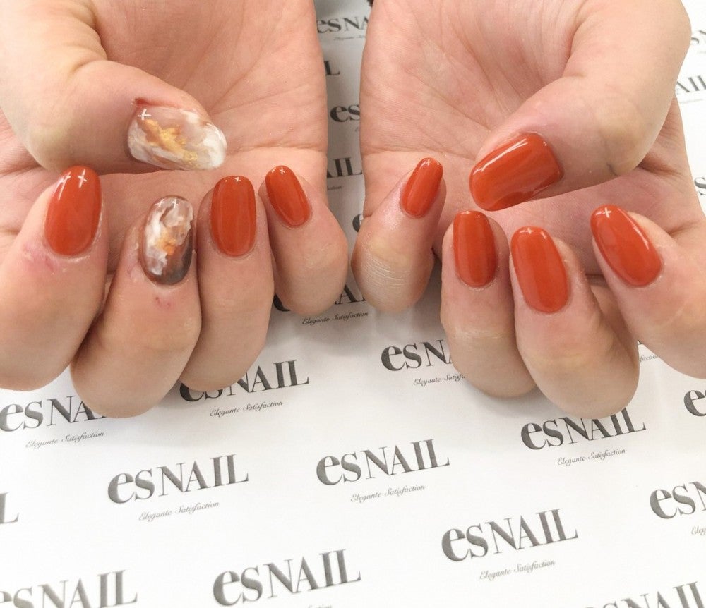 くすんだタンジェリンオレンジにミラーアートを施して /画像提供:esNAILくすんだタンジェリンオレンジに左右一本ずつミラーアートを施すと、ほどよいアクセントに。