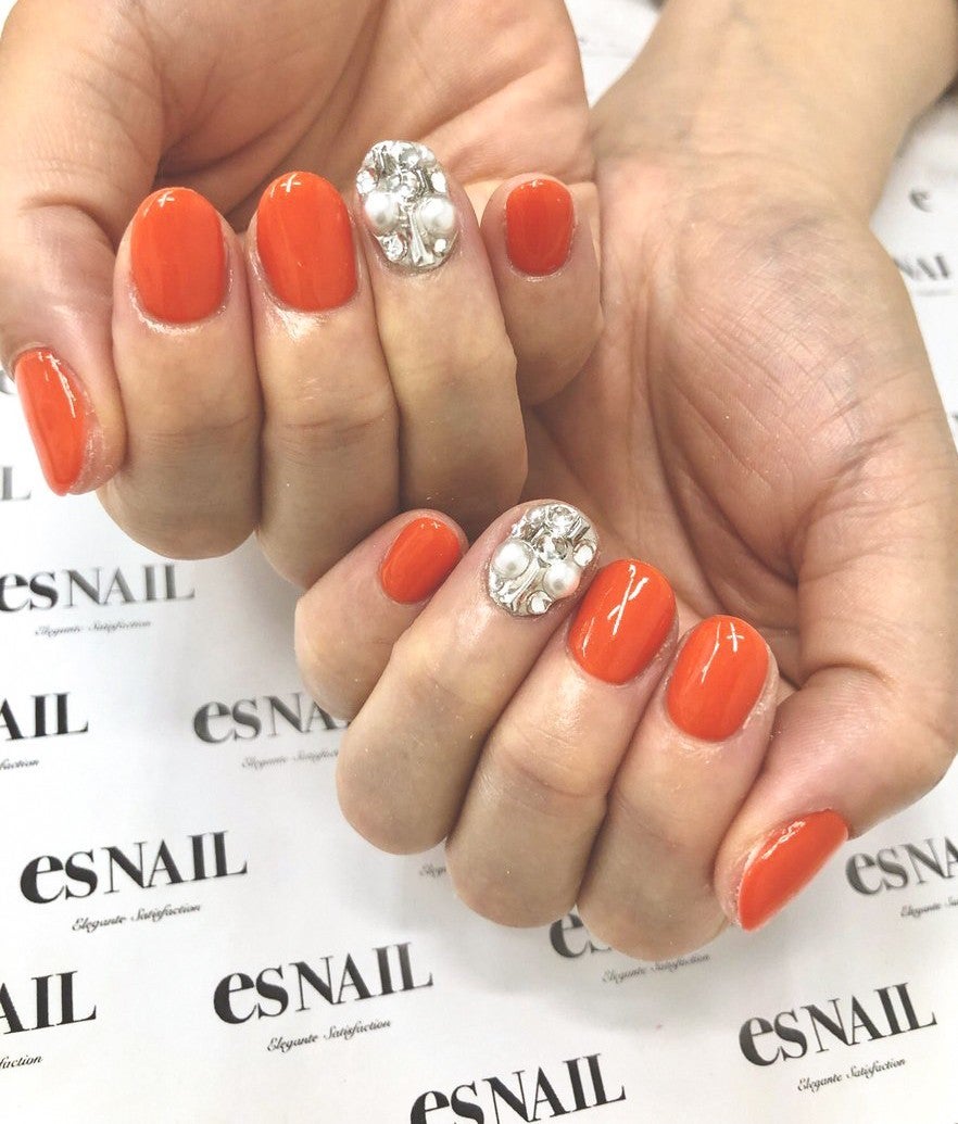タンジェリンオレンジに左右一本ずつビジューをのせた一点豪華主義ネイル。