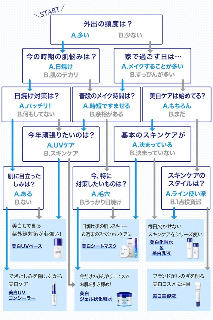 チャート内の各質問に「A」「B」の選択肢から選び、今のあなたに必要な美白アイテムを見つけてみて。