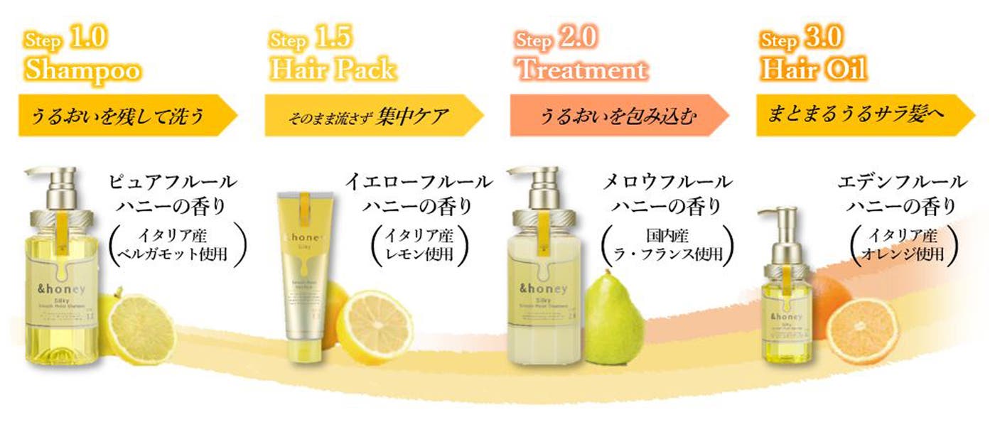 「&honey Silky」シリーズはリフレッシュできる爽やかなフルーティーハニーの香りが特徴。フレグランスにもこだわり、ハチミツに柑橘の香りがアイテムごとにプラスされています。シャンプーはイタリア産ベルガモットを使用したピュアフルールハニー、ヘアパックはイタリア産レモンを使用したイエローフルールハニー、トリートメントは国産ラ・フランスを使用したメロウフルールハニー、ヘアオイルはイタリア産オレンジを使用したエデンフルールハニーの香りを採用。
