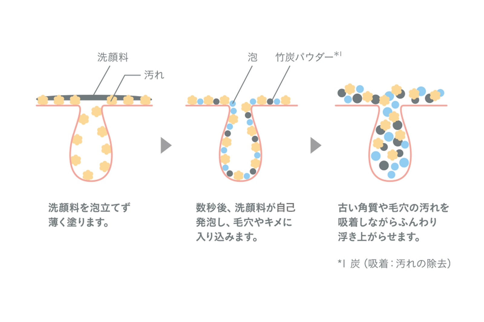 吸着成分「竹炭パウダー」が毛穴に残った皮脂汚れやメイク汚れを吸い寄せてキャッチ。
