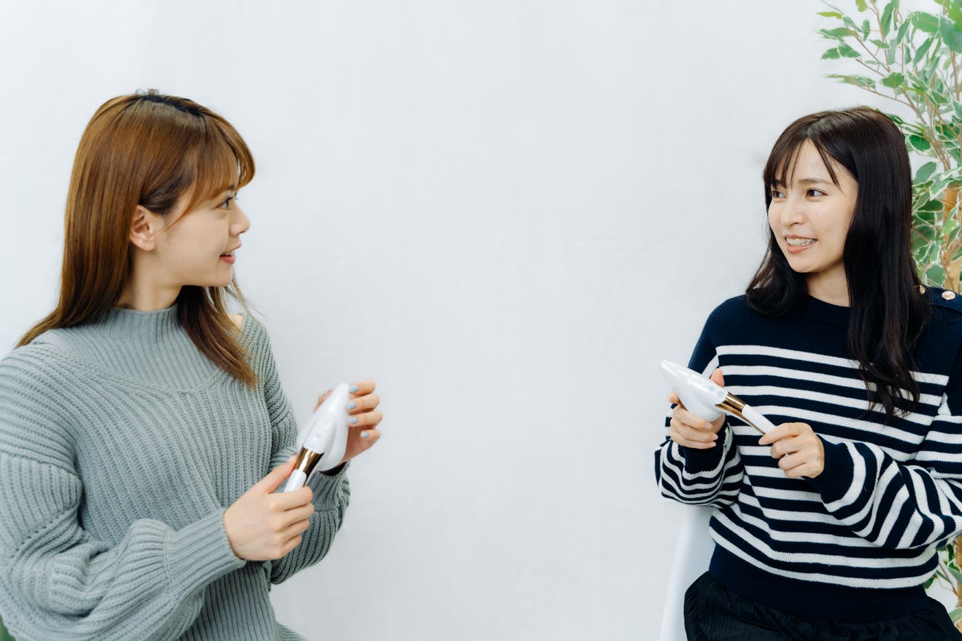スキンアイロンを手にした2人は、「本当のアイロンみたいで形も可愛い」「インテリアにも馴染むし、出しっぱなしにしてもよさそう」と、デザインから高評価。コードレス&軽量なデザインなので、お手入れ中もストレスフリーで疲れ知らずなのも、嬉しいポイントです。