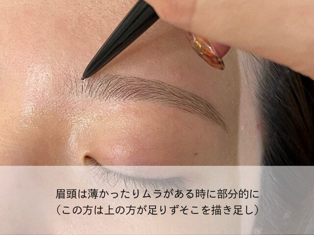 ③ 眉頭は基本的に描かなくて良いですが、毛量にムラがある方、上ラインが足りない方は部分的に書き足します。