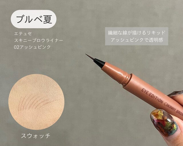 くすみのあるニュアンスメイクがお似合いになる人が多い印象のブルベ夏の眉メイクには、繊細な線が描けるアイブロウリキッドが大人気です。