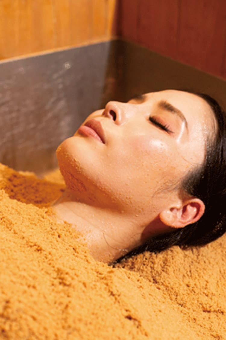ヒノキパウダーと米ぬかで満たされた浴槽のなかに体を埋めて、温めながら瞑想するぜいたくな15分。