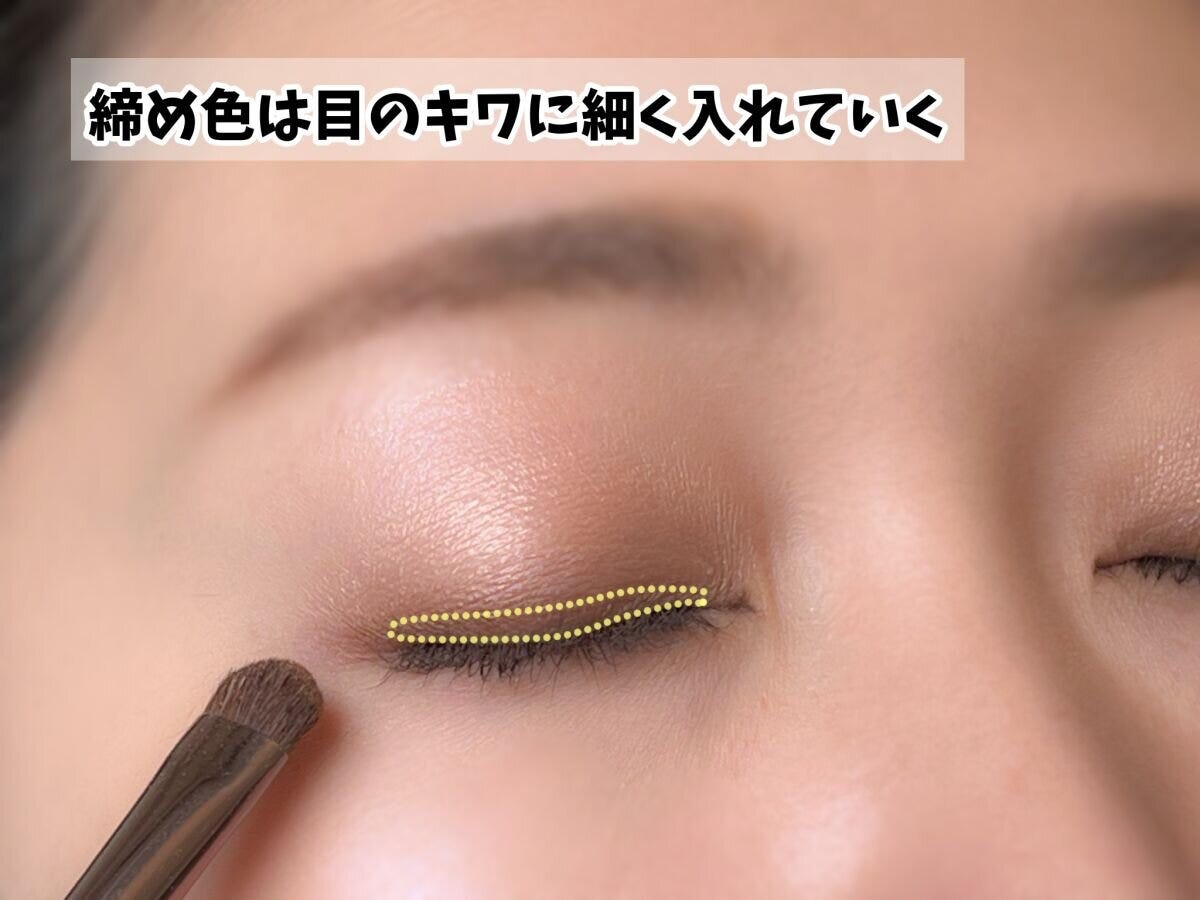 締め色は、目元をはっきり見せるための影の役割を担います。「濃い色は難しそう」と感じる人も多いですが、太く入れなければ大丈夫!上まぶたの目のキワに、細く入れるのが正解です。
