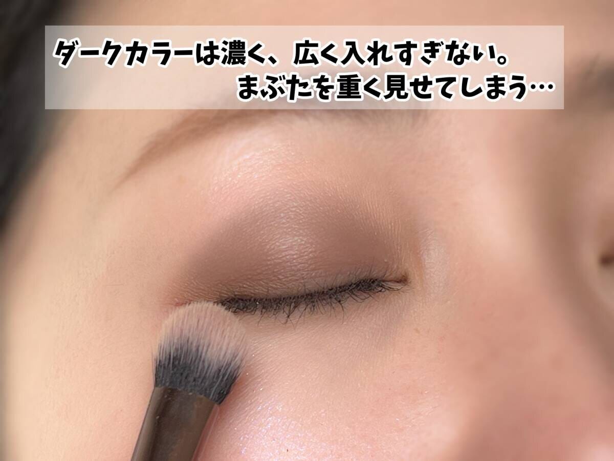 グラデーションを作ろうとして、濃いブラウンやグレーを二重幅いっぱいに広げていませんか?濃い色は引き締め効果がある反面、広く入れすぎるとまぶたが沈み、目の開きが悪く見えてしまいます。