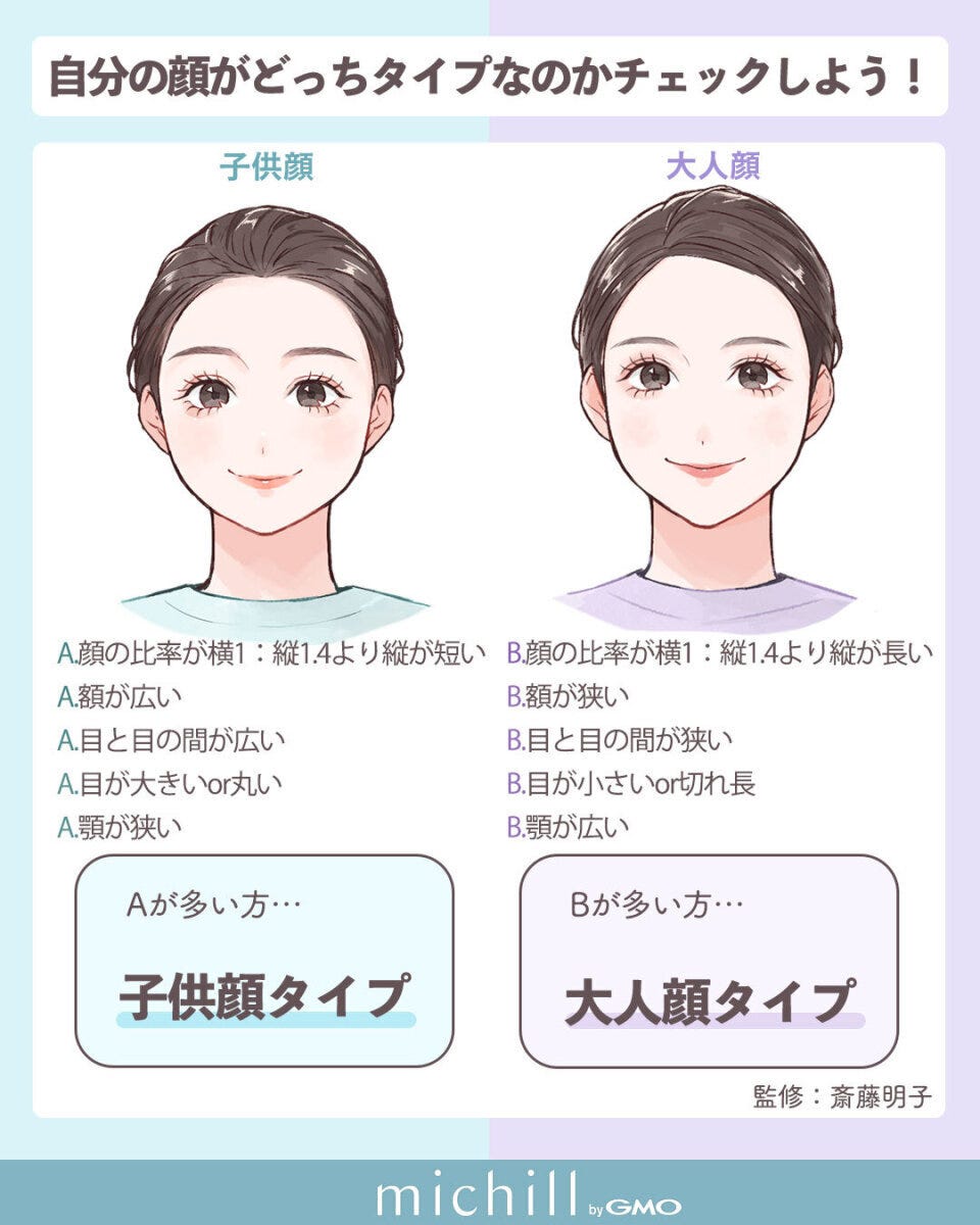 顔立ちは大きく分けて「大人顔タイプ」と「子供顔タイプ」に分かれ、それぞれ似合うメイクやヘアスタイルのバランスが異なります。