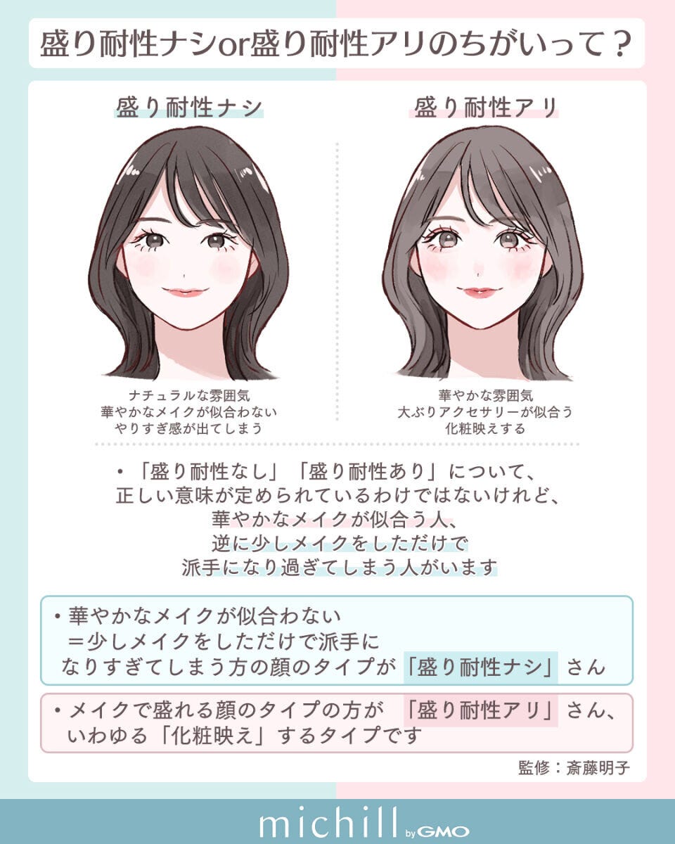 同じメイクをしても「なんだか派手に見える…」と感じる人もいれば、逆にしっかりメイクをするほど魅力が引き立つ人もいます。この違いが「盛り耐性ナシ」と「盛り耐性アリ」です。