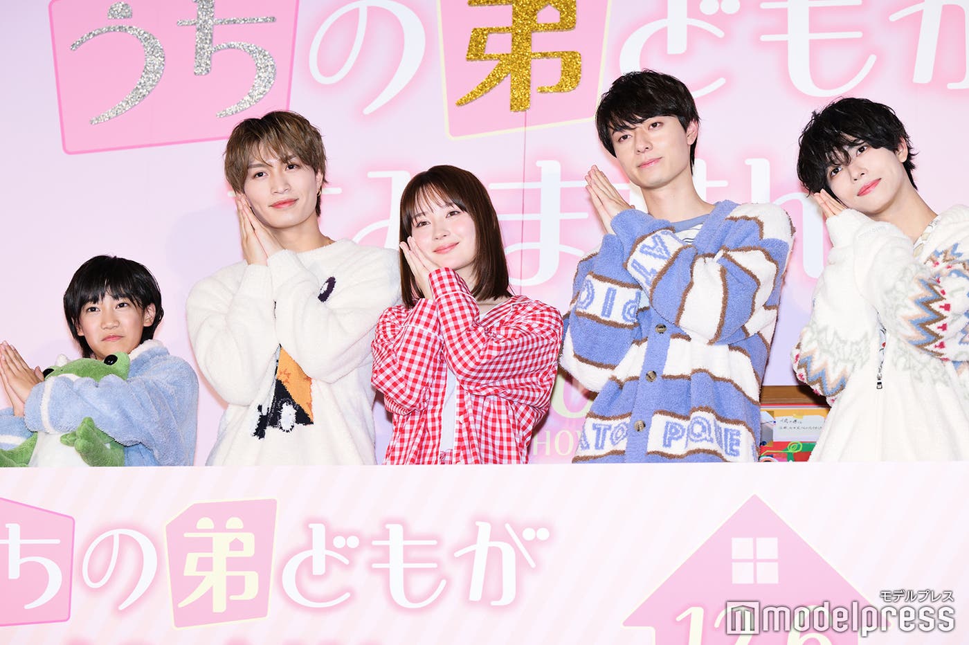 女優の畑芽育、HiHi Jets作間龍斗、美 少年・那須雄登、少年忍者・織山尚大、内田煌音が11月14日、都内で開催された映画『うちの弟どもがすみません』(12月6日公開)プレミアムパジャマパーティー(完成披露試写会)に出席。パジャマ姿で登場した。