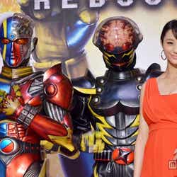 15日、都内で行われた映画「キカイダー REBOOT」完成披露イベントに出席した高橋は、キカイダーのイメージカラーの一つである真っ赤なロングドレス姿で登場。スリットから輝く美脚をのぞかせた。