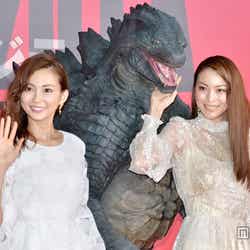 レッドカーペットに登場した蛯原はエクリュのシースルーのワンピース、押切はホワイトのワンピースを着こなし、美脚を披露。詰めかけたファンを魅了した。また、安藤もマーメイドシルエットのブラックのロングドレスで華麗にドレスアップ。ファッションのポイントを聞かれると、安藤はゴジラを意識したといい「黒ベースで、後ろ長めで(笑)」と紹介した。