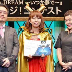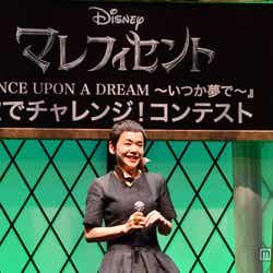11日、都内にて行われた映画「マレフィセント」主題歌「ONCE UPON A DREAM~いつか夢で~」歌でチャレンジ!コンテストに特別ゲストプレゼンターとして登場した大竹。黒のワンピースに、ゴールドのつけ襟を合わせ、映画の世界観を用いた着こなしで登場した。