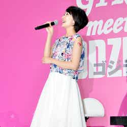 ボタニカル柄のノースリーブのトップスに白のスカートを合わせて、美脚をチラ見せしたスタイルで登場すると、会場に集った100人あまりの女性から「めっちゃ可愛い」「スタイル良い」「細い」という歓声が殺到した。