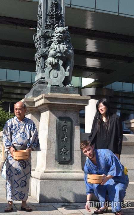 その後、日本橋の袂で中央区の矢田区長らとともに打ち水にトライしました。