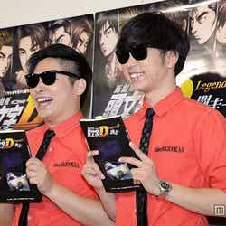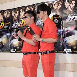 同作は、累計部数4860万部を誇る、しげの秀一原作のコミックスを最新技術により映像化した新劇場版3部作の第2弾。公道最速を競う走り屋たちの熱いカーバトルが描かれ、主人公・藤原拓海の乗っているトヨタのスポーツカーが「AE86(通称:ハチロク)」という縁から出演が決定し、初めて声優業にチャレンジした。2人は、GT-Rとハチロクの熱いカーバトルを繰り広げるというシーンに出演し、バトルを見守るギャラリーの男L(はまやねん)、男G(田中)達を演じたが、「難しかった」(はまやねん)、「口のパク始めとパク終わりを合わせるのがな。言い終わりでまだ(映像が)動いてたりした(笑)」(田中)と少々苦戦した様子。しかし、「でも楽しかったです!」(はまやねん)、「自分の声じゃない感じがした」(田中)と初アフレコ体験を嬉しそうに振り返っていた。