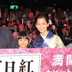 9日、都内にて行われた長編アニメ映画『百日紅~Miss HOKUSAI~』の初日舞台挨拶に登壇。作品の内容に合わせ、艶やかな着物姿で登場した杏は「一年前くらいの早い段階にお話をいただいて快諾しました。大好きな杉浦日向子さんの作品に憧れていたアニメーション映画に関わらせていただけて光栄でした」とオファーを受けた際の喜びを語りながら、主題歌を歌う椎名林檎のファンだと公言し「大好きな杉浦日向子さんの作品に出演させていただけるだけでも嬉しかったのに、その主題歌が大好きな椎名林檎さんということで、小躍りしちゃうくらい嬉しかったです」と笑顔。「(今日を)迎えてみればあっという間で、本当に今日のこの日を待ち遠しく思っておりました。願わくば空いている席に座って私も今日見てみたいなと思うくらい、何度も見たくなる作品だと思います。今日、皆さんに見ていただけること嬉しく思います」と無事に初日を迎えられたことに感謝した。