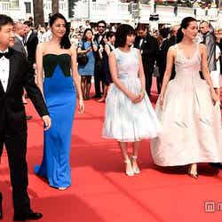 綾瀬はクリスチャン・ディオールのオートクチュールで胸元のラインが美しい白のクラシカルなドレス、長澤はステラマッカートニーの深いグリーンとブルーのタイトなロングドレス、夏帆はイヴ・サンローランの鮮やかな藍色のシックなロングドレス、広瀬はオリジナルで水色と白のチェック柄の爽やかなシフォンドレスに身を包み是枝裕和監督とともに登場。笑顔でレッドカーペットを歩いた。