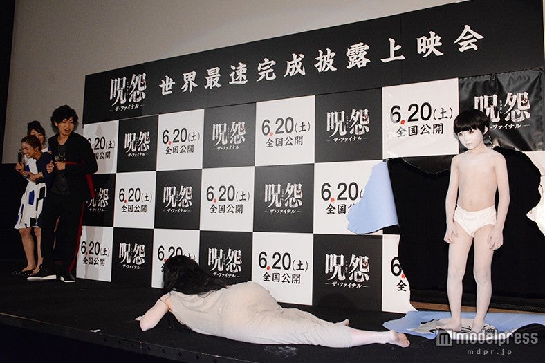 この日はキャスト陣にサプライズで、登壇中突如バックパネルを突き破り伽椰子(最所美咲)&俊雄(小林颯)が登場。観客は“俊雄お面”を一斉につけるという演出で盛り上げた。このほか同上映会には、平、おのののか、落合正幸監督も出席した。(modelpress編集部)