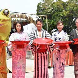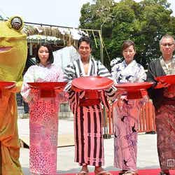 市原は15日、東京の神田明神で映画『極道大戦争』(6月20日公開)のヒット祈願を行った。夏先取りの浴衣姿で炎天下の中、勢いよくドラを鳴らした市原は「(ヒットへの)気持ちが強すぎて、ドラを叩く時に手までいっちゃって。腫れてますね……市原隼人です」とハプニングを語りながら熱い挨拶。作品については「カエルは出てくるわ、カッパは出てくるわ。これって極道だよな?と思ったくらい、こんなにクレイジーな台本は初めてでした」とアピールした。