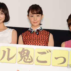 11日、都内にて映画「リアル鬼ごっこ」の初日舞台あいさつが行われ、ともにトリプルヒロインを務めたトリンドル玲奈、真野恵里菜と、園監督とともに出席。