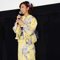 25日、都内にて行われた映画『リアル鬼ごっこ』の大ヒット御礼夏祭りイベントに篠田麻里子、真野恵里菜とともに出席。それぞれ個性豊かな浴衣姿を披露した。