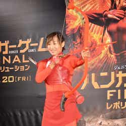 同イベントには“戦うヒロイン代表”としてジェニファー・ローレンス演じる同作の主人公・カットニス・エヴァディーンに扮し、赤い戦闘服で登場。アクションシーンが見どころの同作にちなみ、約2ヶ月ぶりにスパーリングを行った。「このあいだグローブを置いたばかりなんですけど…」と戸惑いつつ、「あんまり人を嫌いにならないんですけど、唯一胸を張って嫌いと言える人」と語っていた山ちゃんをイメージした赤い眼鏡のシールが貼られたサンドバッグに、渾身のパンチを連打。「闘争心が湧きました。楽しかったです」と息を切らしていた。また、カットニスが弓の名手であることから、弓射にもチャレンジ。「本番前にちょっと練習した時は全然出来なかった」と言いつつも、一発で的を射抜くと「いやー良かったです」とホッとしていた。(modelpress編集部)