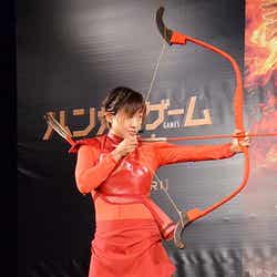 また、カットニスが弓の名手であることから、弓射にもチャレンジ。「本番前にちょっと練習した時は全然出来なかった」と言いつつも、一発で的を射抜くと「いやー良かったです」とホッとしていた。(modelpress編集部)