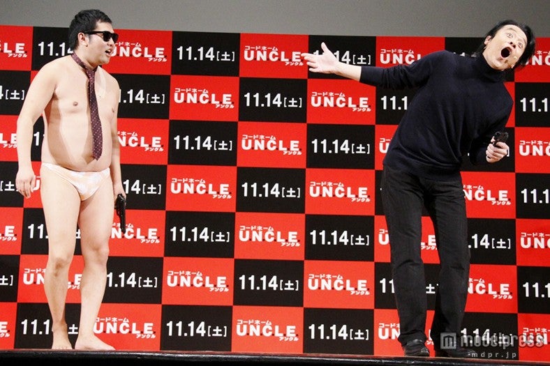 5日、都内で行われた映画『コードネーム U.N.C.L.E.』(11月14日公開)の特別試写会に、お笑いタレントのとにかく明るい安村と、“吉本の福山雅治”こと大山英雄と出席。同作のキーワード“史上最強にして禁断のコンビ”にちなみ、「全裸に見えるポーズ」の安村、「福山雅治に見えるポーズ」の大山が結成した「コードネーム あ・ん・ぐ・る」が、コンビネタ3種類を披露すると、橋本は「お2人のネタ面白かったですけど私の位置からは履いているのが見えていました」と笑いながらコメントした。