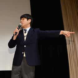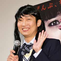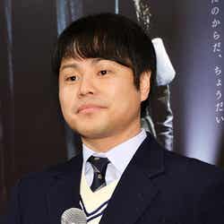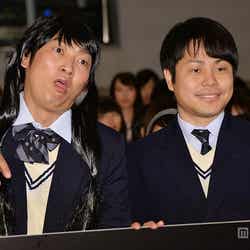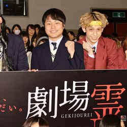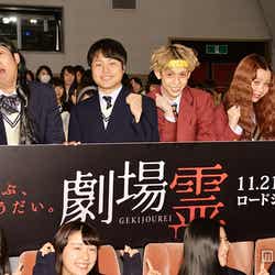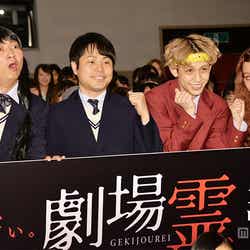 18日、都内で行われた映画「劇場霊」(11月21日全国ロードショー)の試写会イベントに揃って4人で登壇。観客は女子学生限定ということに因み、全員制服姿で、石田明はキュートな女装姿を披露した。
