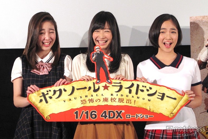 1日、都内で行われた「ボクソール★ライドショー 恐怖の廃校脱出!」(2016年1月16日公開)の舞台挨拶に共演の渡辺恵伶奈、松本妃代と出席。同作は脱出ホラーをテーマに、Jホラーの鬼才・白石晃士監督がメガホンを執った日本初の4DX専用ムービーとなっており、体当たりでホラー映画に挑戦した岡本は、今回の撮影を「朝から晩まで走り回って、汗だくになりながら戦っていました。(さらわれた)友達を助ける役なので、正義感が強いような、しっかりした女の子になるように頑張りました」と振り返り、充実した様子。渡辺も岡本の人柄を「実際しっかりしてる!年下とは思えなくて、いつも助けられました」と称えた。